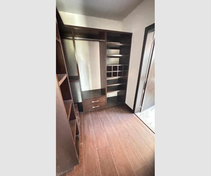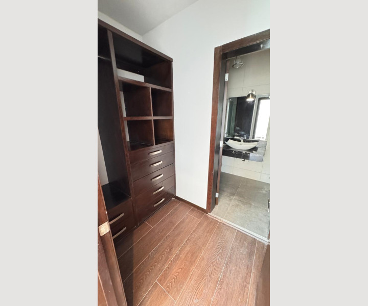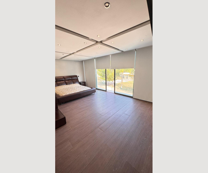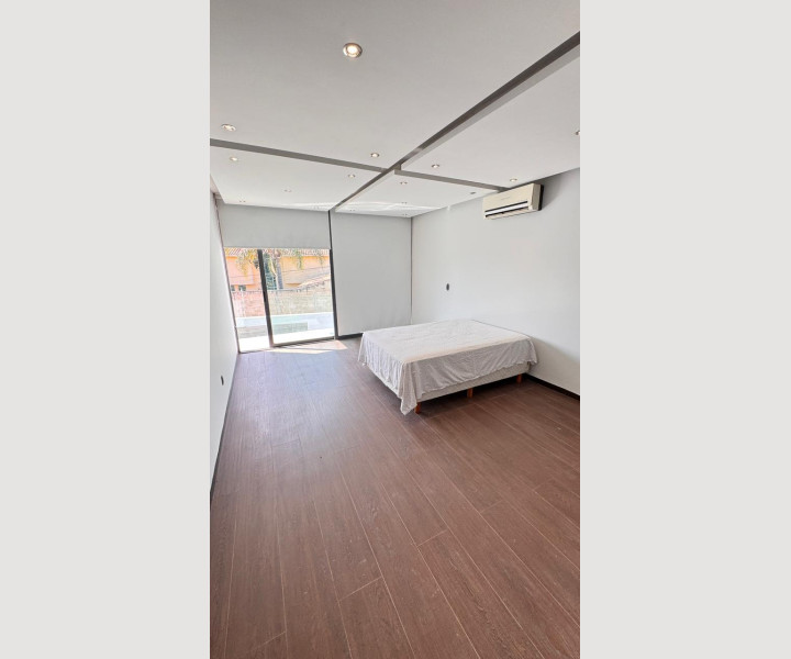 La recámara principal ofrece un ambiente amplio y acogedor, con excelente iluminación, piso tipo madera, clóset y aire acondicionado, creando un espacio ideal para el descanso.