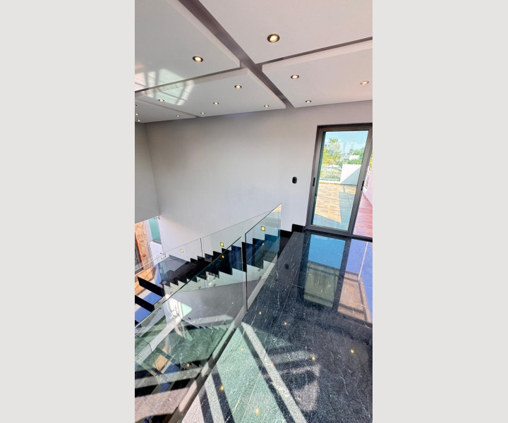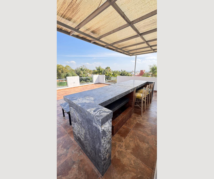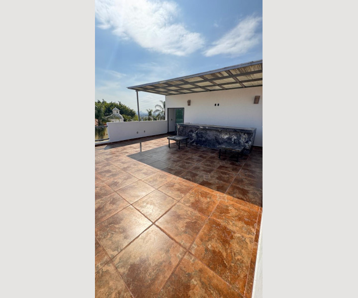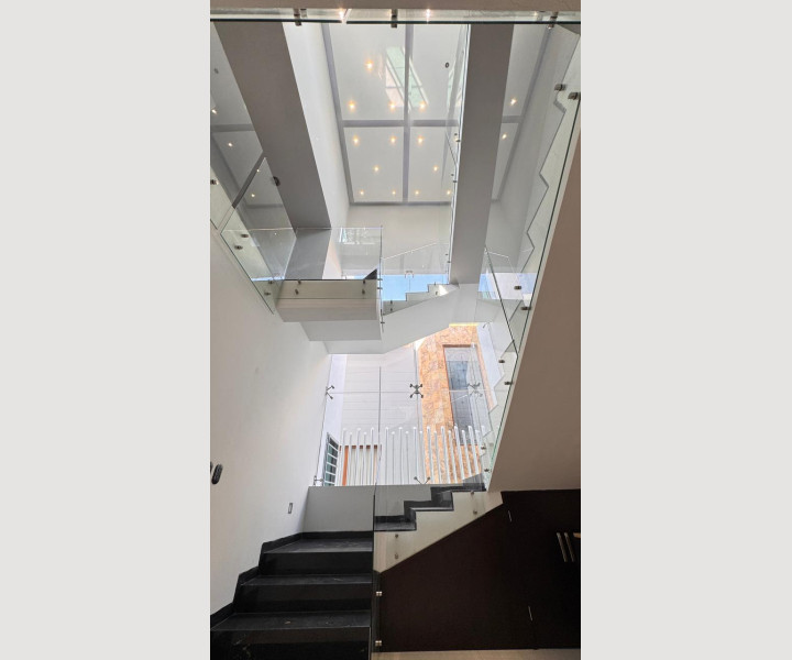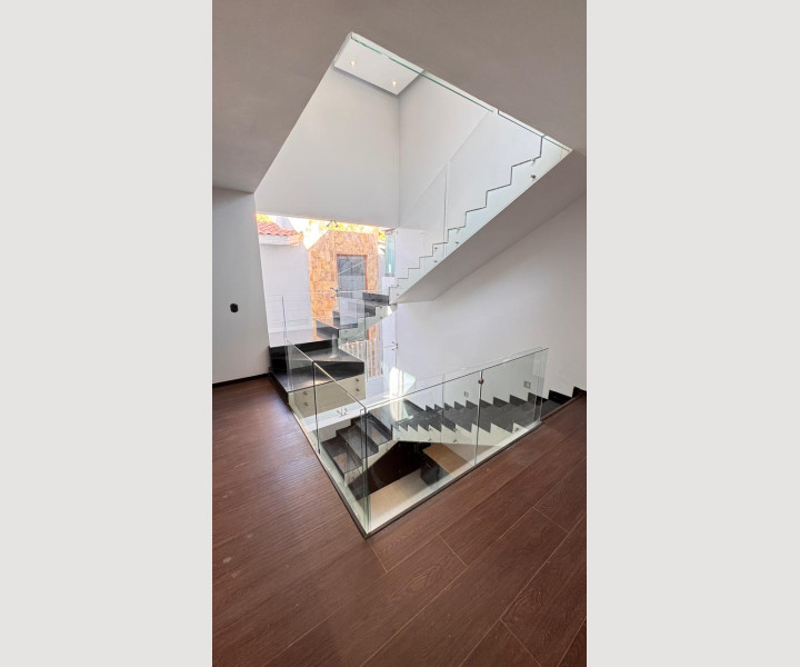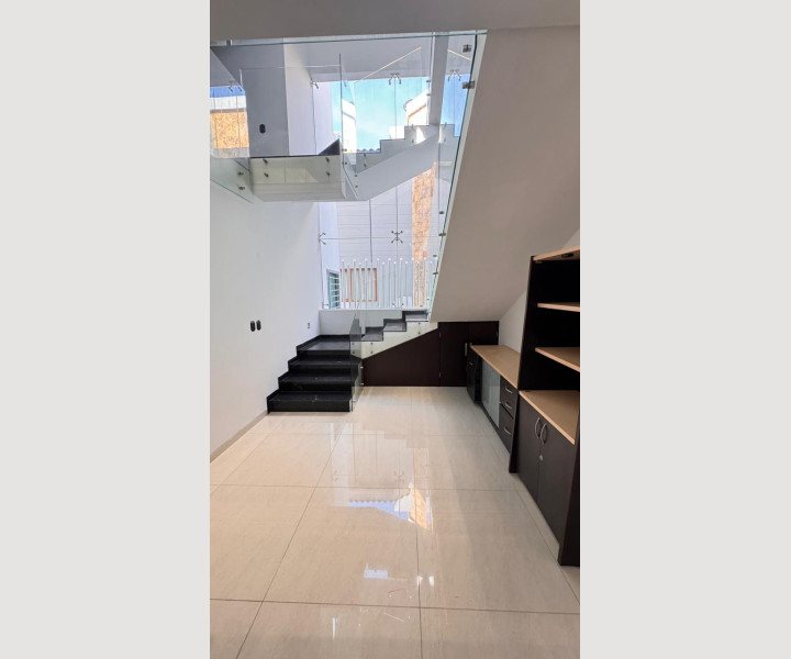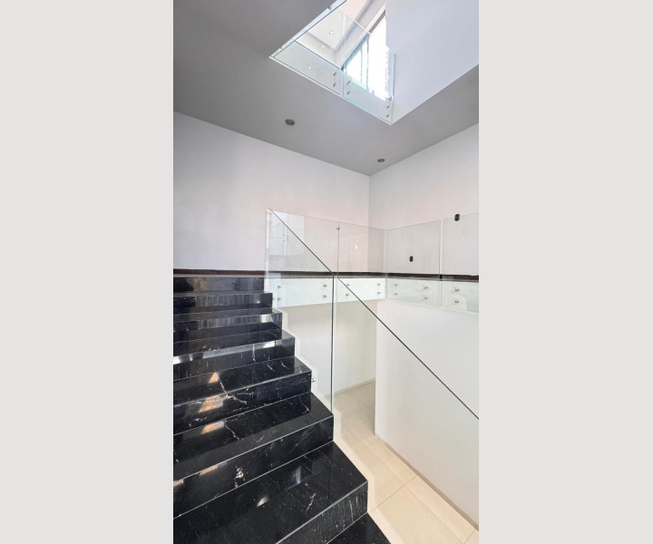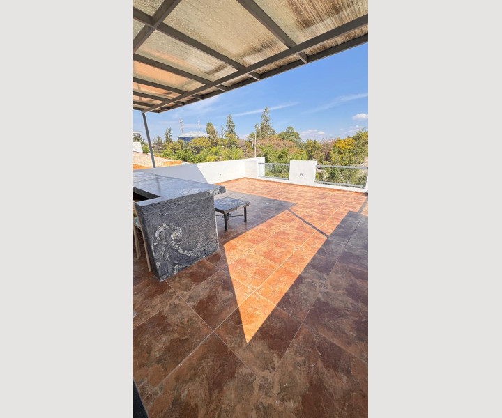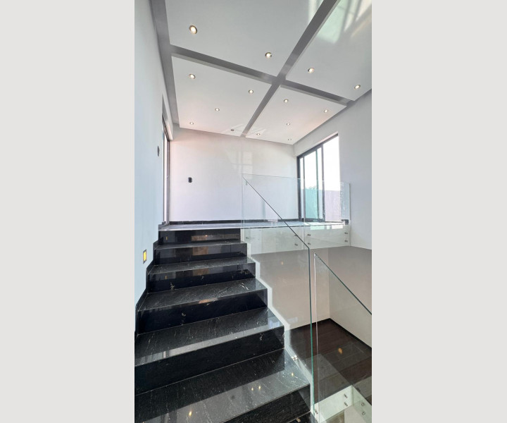 Uno de los grandes diferenciadores de esta propiedad es su escalera con diseño arquitectónico, con escalones de piedra natural y barandales de cristal, que aporta amplitud visual y un toque de lujo. En la parte superior, la casa cuenta con una terraza espectacular, equipada con barra de granito y área social, ideal para reuniones, asados o simplemente disfrutar de una vista abierta y despejada.