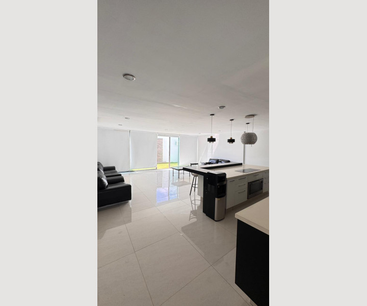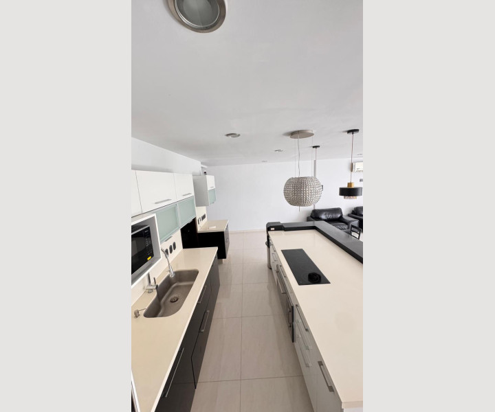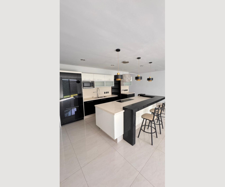 En planta baja encontrarás una cocina integral de diseño, totalmente equipada, con isla central y barra desayunadora, cubiertas de cuarzo y una excelente iluminación decorativa que realza cada espacio.