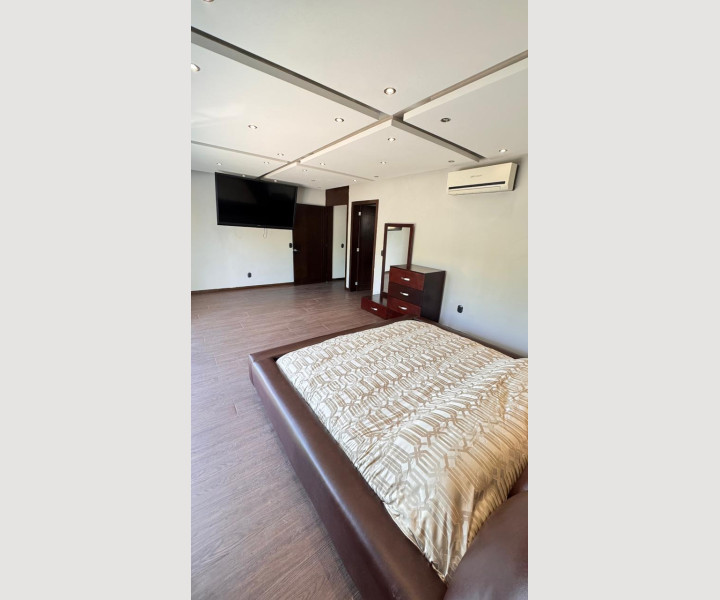 La recámara principal ofrece un ambiente amplio y acogedor, con excelente iluminación, piso tipo madera, clóset y aire acondicionado, creando un espacio ideal para el descanso.
